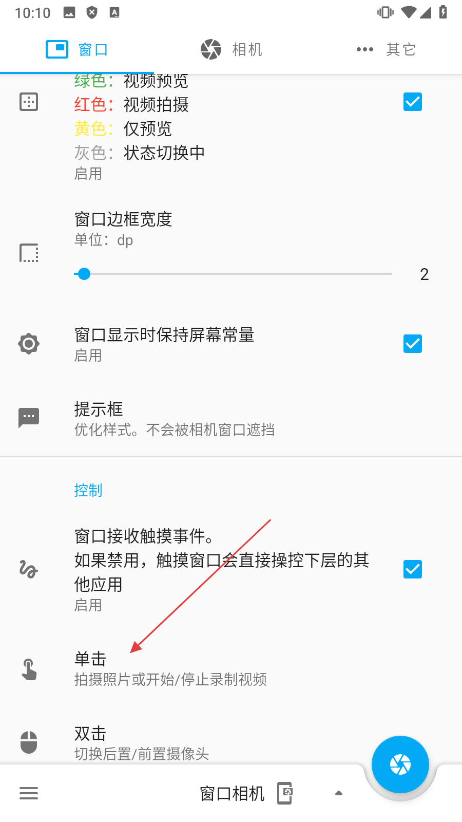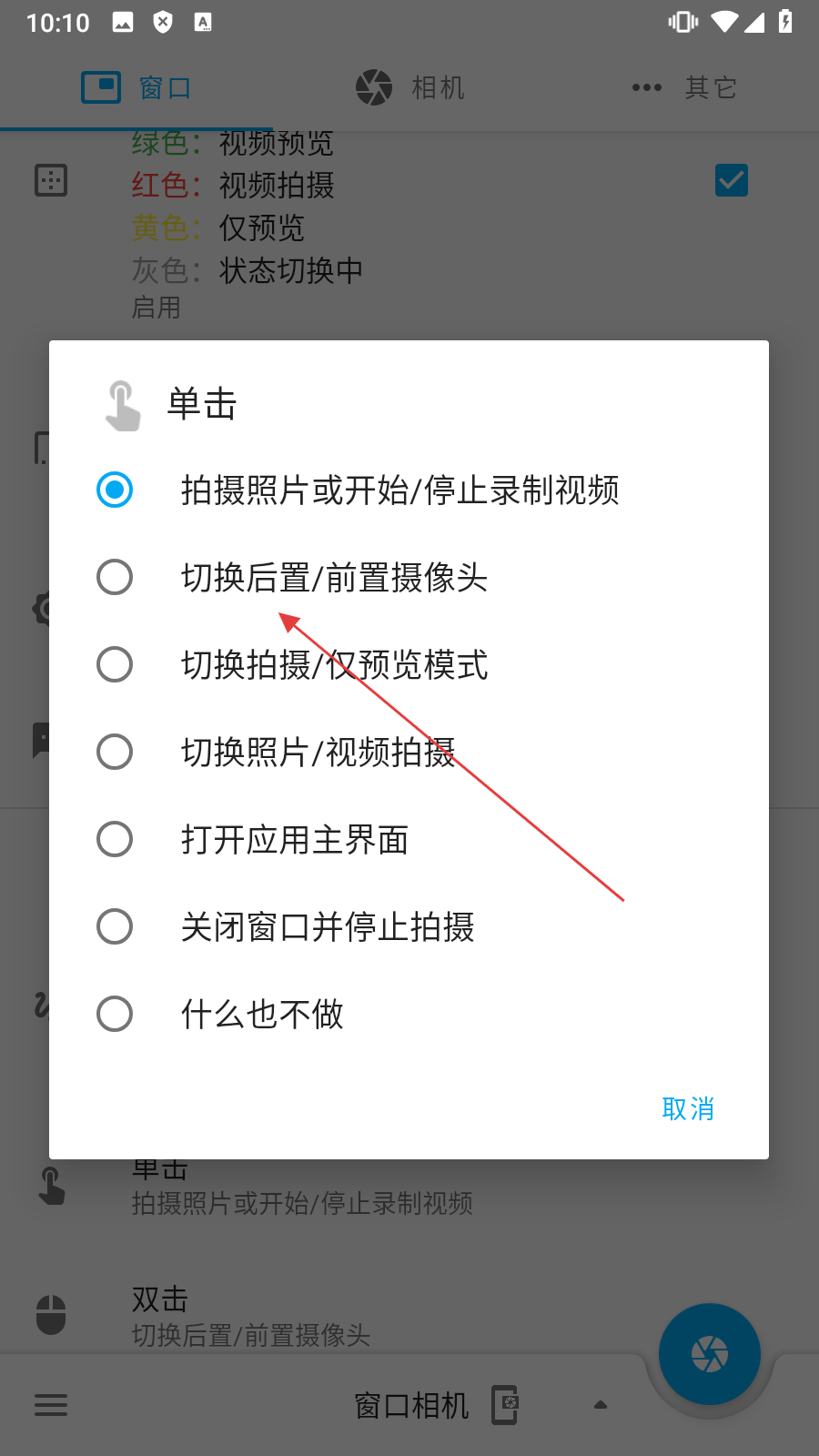4、在页面中选择【切换后置/前置摄像头】,即可完成单击功能设置。