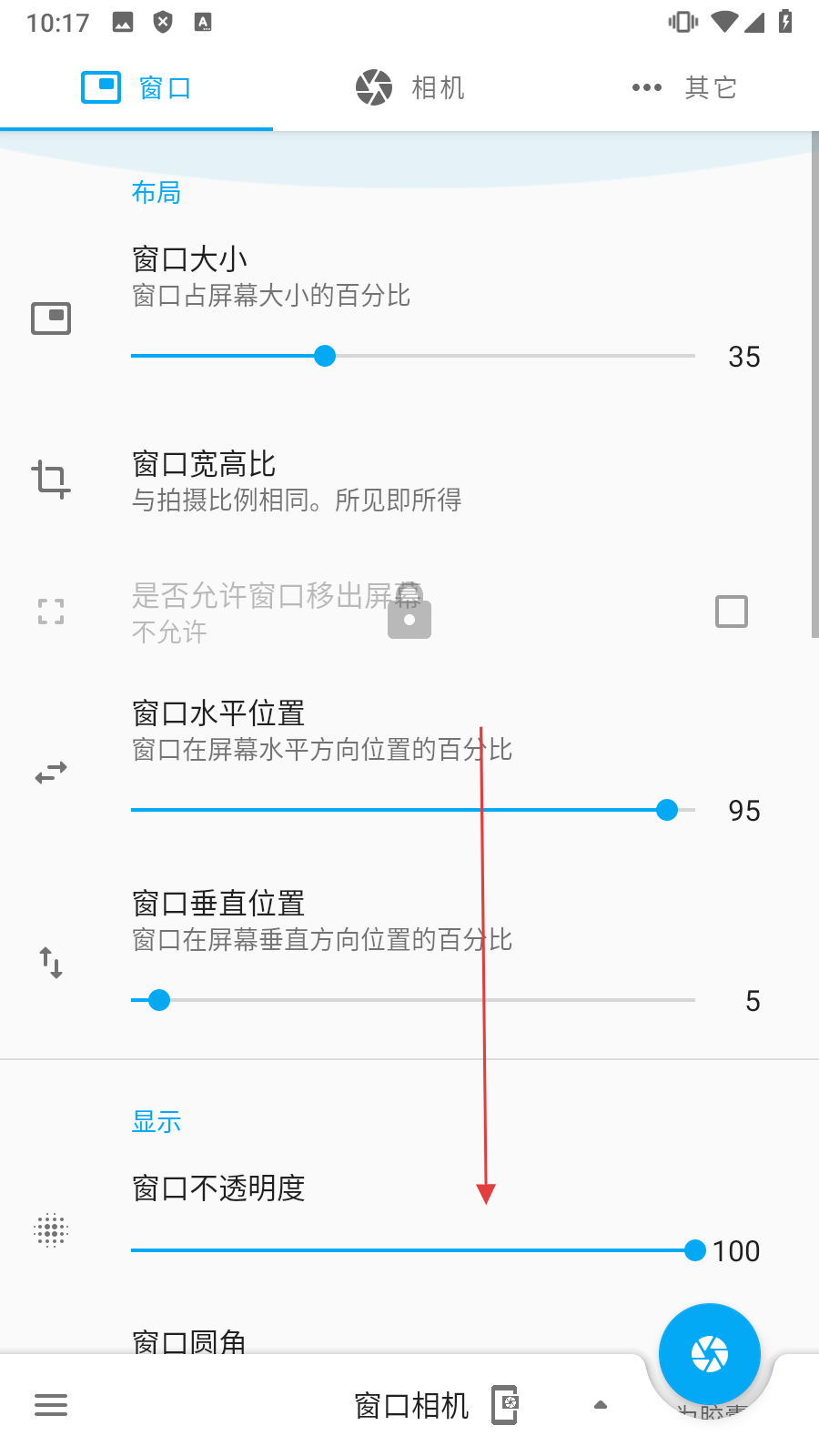 2、在窗口设置页面【向下滑动】,查看更多窗口配置选项。