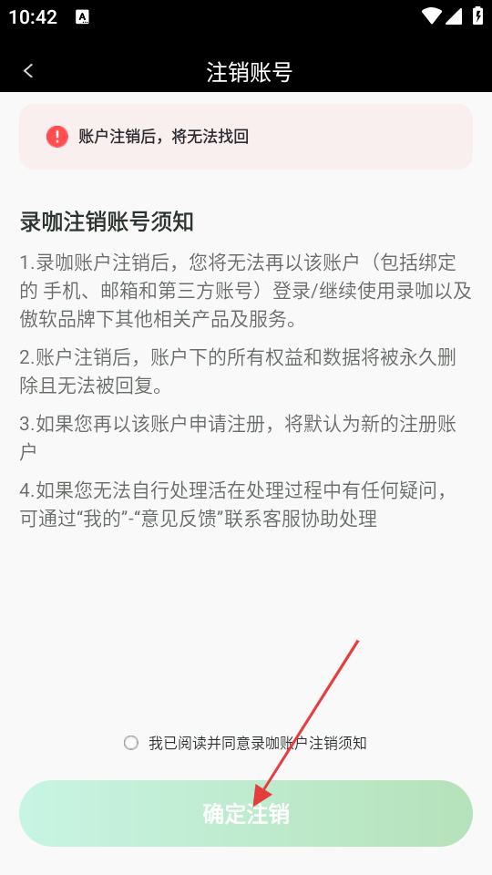 4、阅读【录咖注销账号须知】,勾选同意后点击【确定注销】完成账号注销。