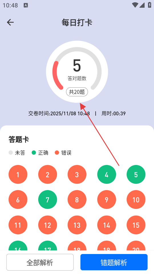 4、答题完成后,可查看答对题数等打卡结果,还可选择解析功能回顾题目。