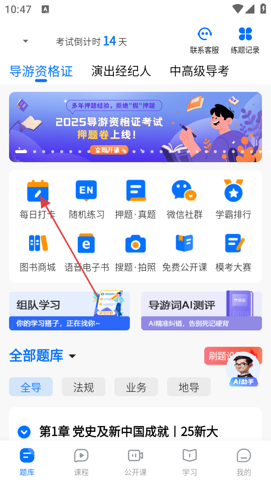 1、在题库页面中,点击【每日打卡】,进入打卡界面。