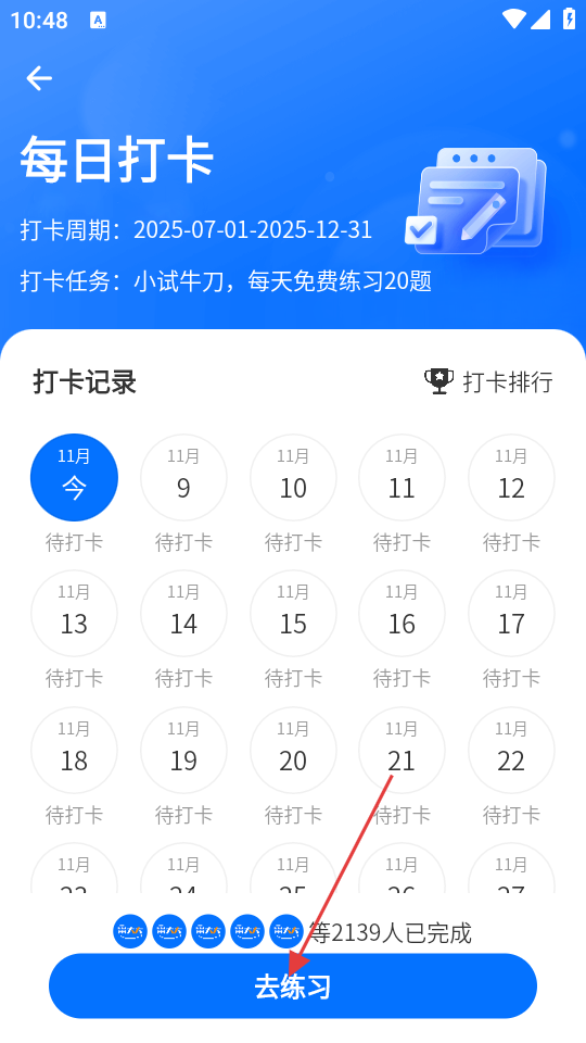 2、在每日打卡页面,点击【去练习】,开始打卡练习任务。