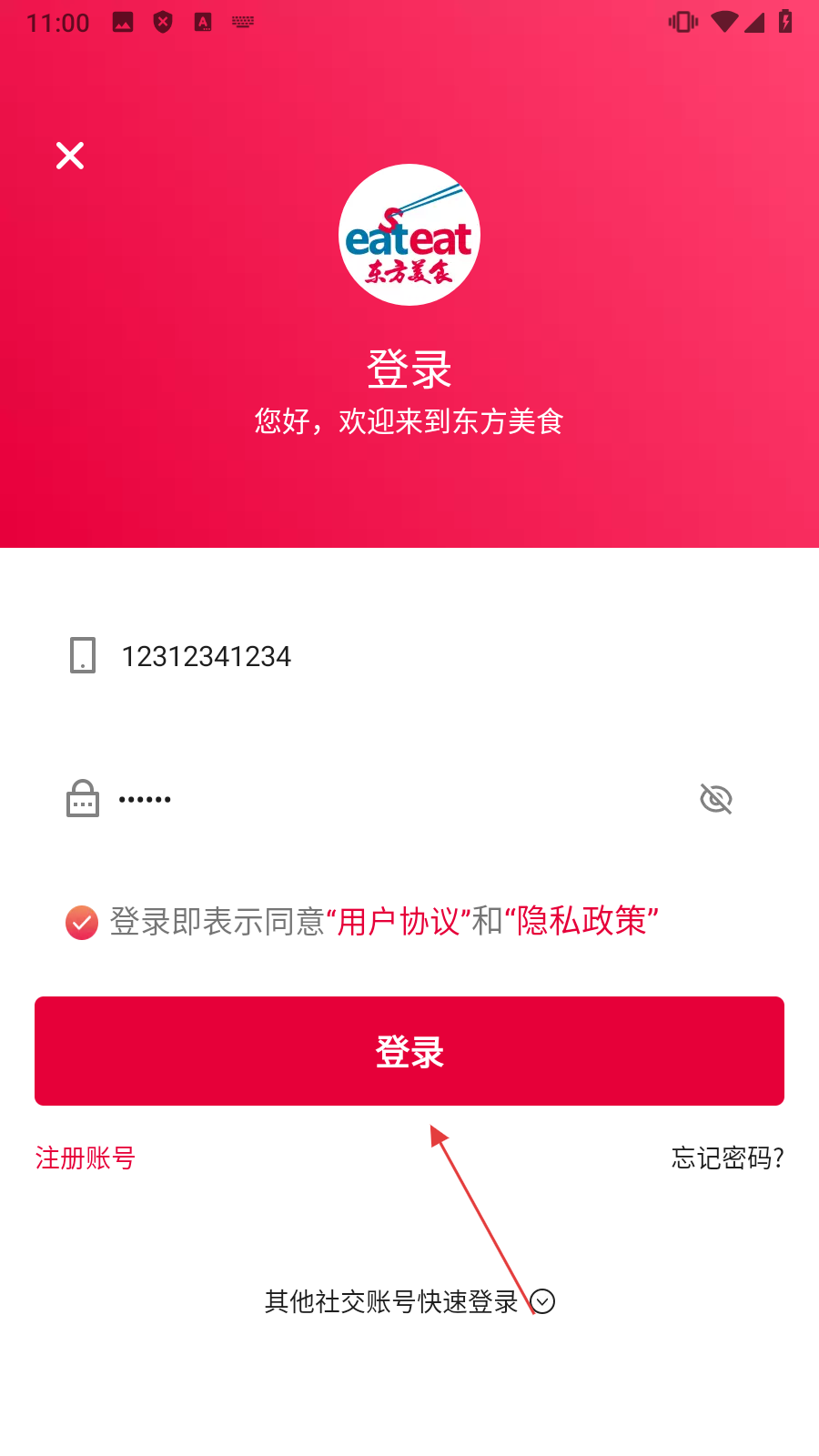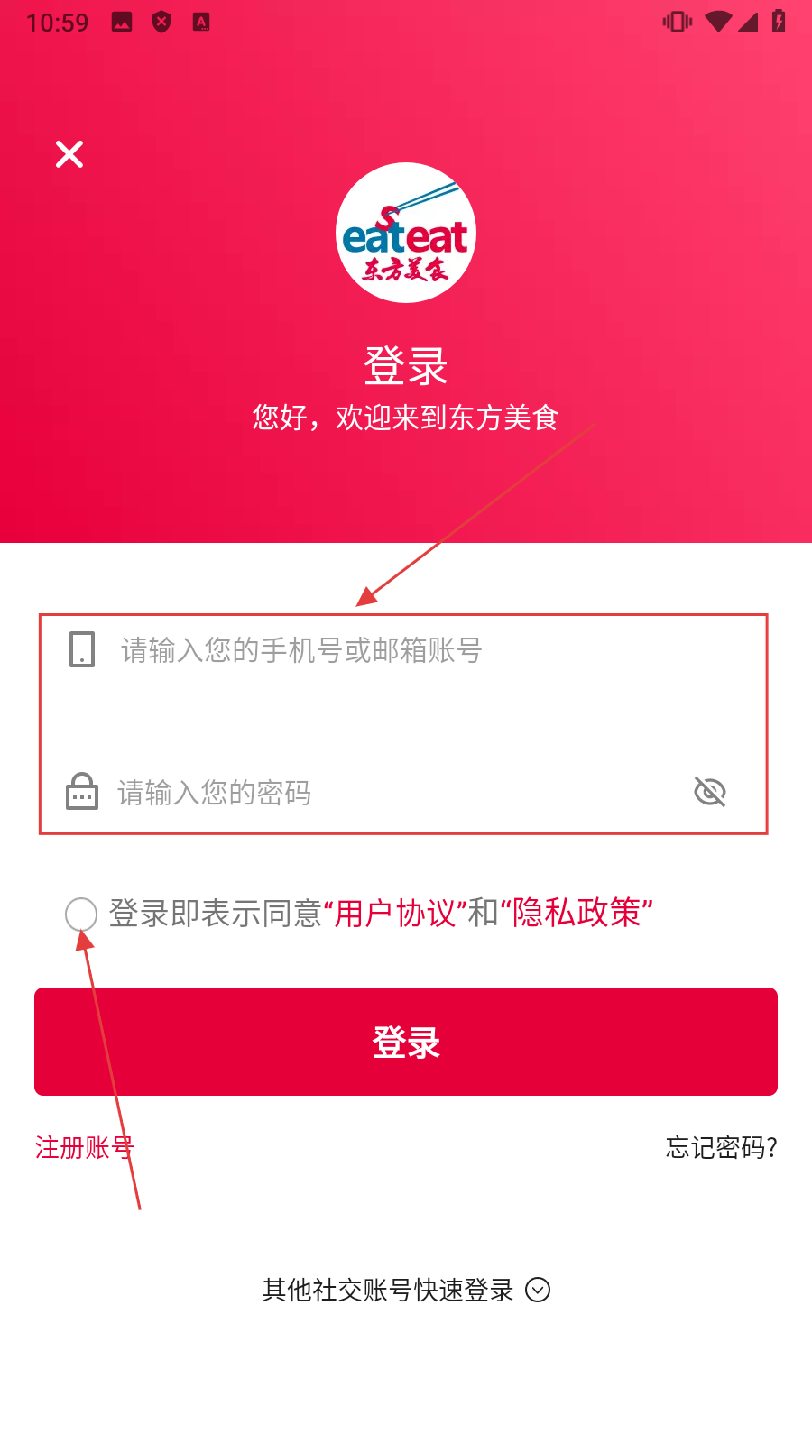 3、在登录页面【填写账号、密码并同意协议】,准备登录。