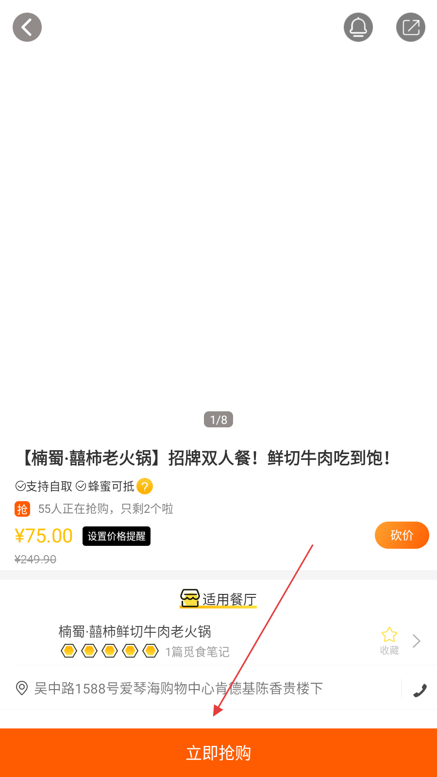 4、在详情页面,点击【立即抢购】,即可完成美食搜索抢购操作。