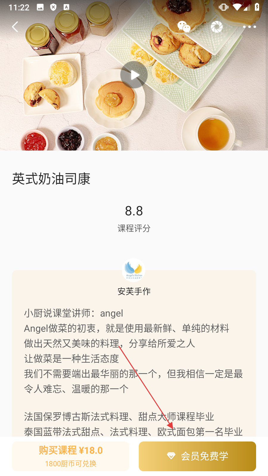 3、在列表中,选择【英式奶油司康】课程,进入课程详情页面。