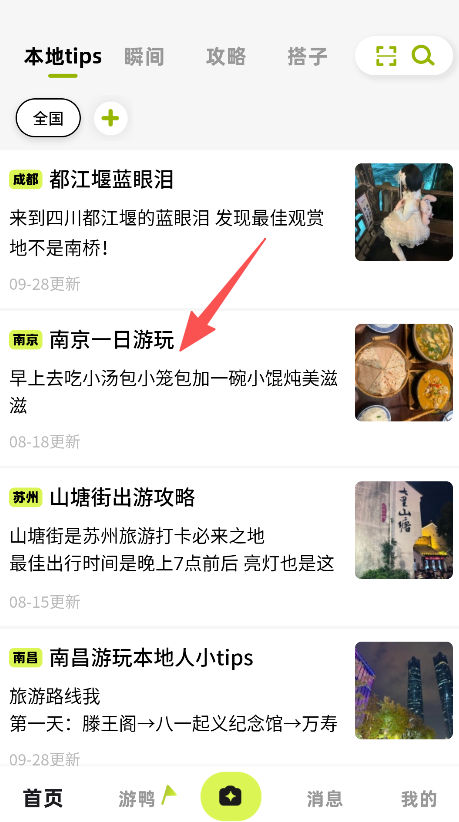1、打开软件,选择本地tips板块,点击如南京一日游的攻略查看。