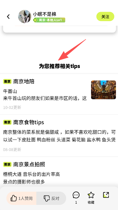 3、推荐精准,根据用户查看的攻略,推荐相关tips,如南京地陪、食物tips等,拓展游玩认知。
