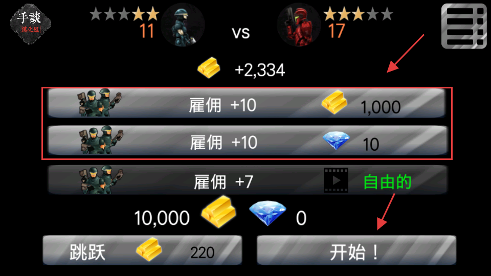2、根据资源选雇佣,【1000】金币或【10】钻石雇+10士兵,壮大队伍后点【开始!】参战。