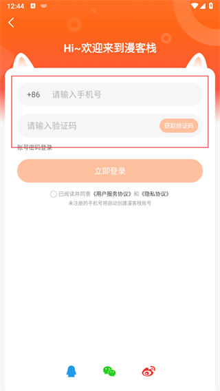 3、在登录页面输入手机号,点击【获取验证码】,将收到的验证码输入对应框内。