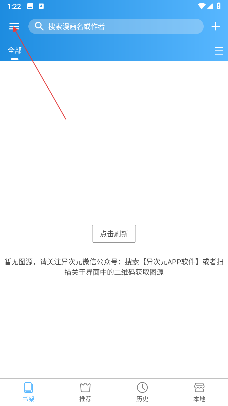 1、在漫画APP书架页面,点击左上角菜单按钮,展开功能菜单。
