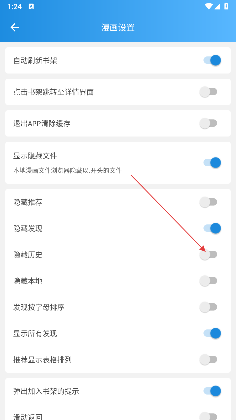 4、在漫画设置页面找到【隐藏历史】选项,开启该功能,可隐藏漫画阅读历史,保护个人阅读隐私。