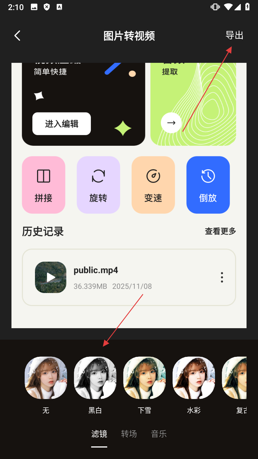 4、在页面中【设置滤镜】后,点击【导出】,即可完成图片转视频操作。