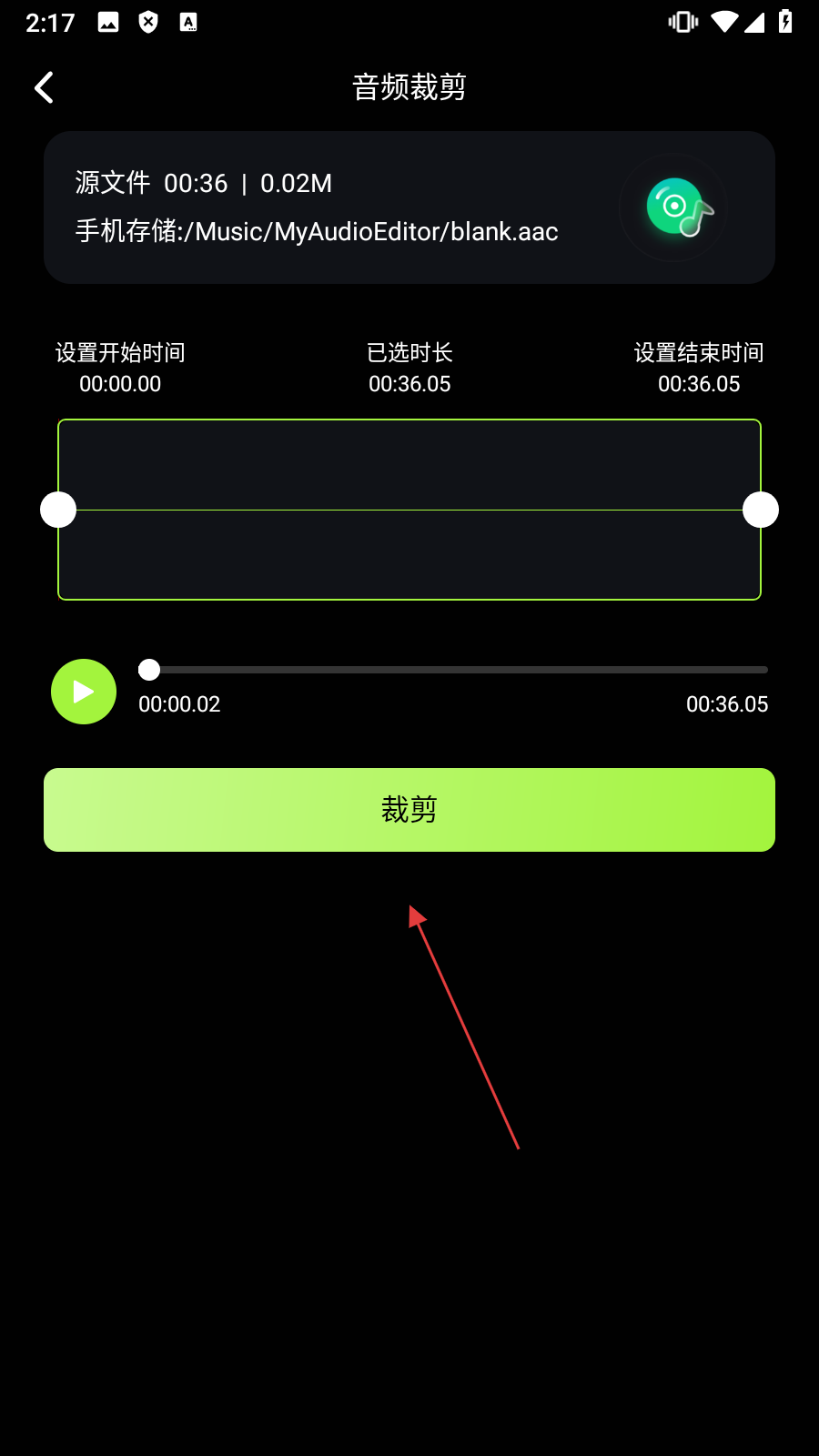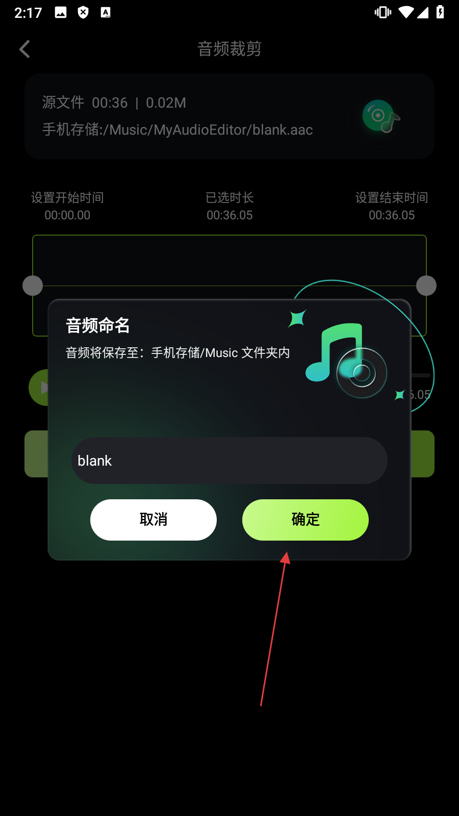4、在窗口中点击【确定】,即可完成音频裁剪操作。
