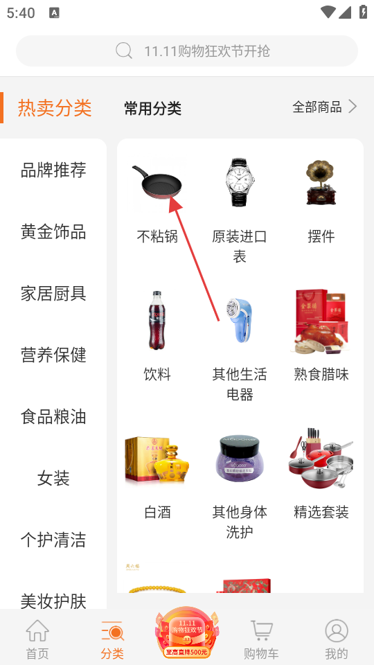 2、在商品分类页面中,点击【不粘锅】分类,可进入不粘锅商品列表页面。