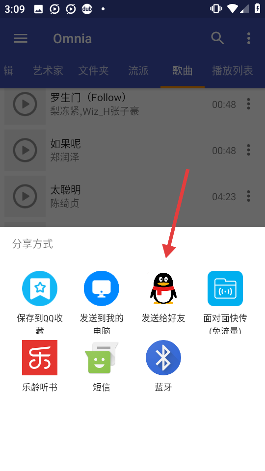 4、在分享方式界面中,点击【发送给好友】图标,可通过QQ将歌曲分享给好友。