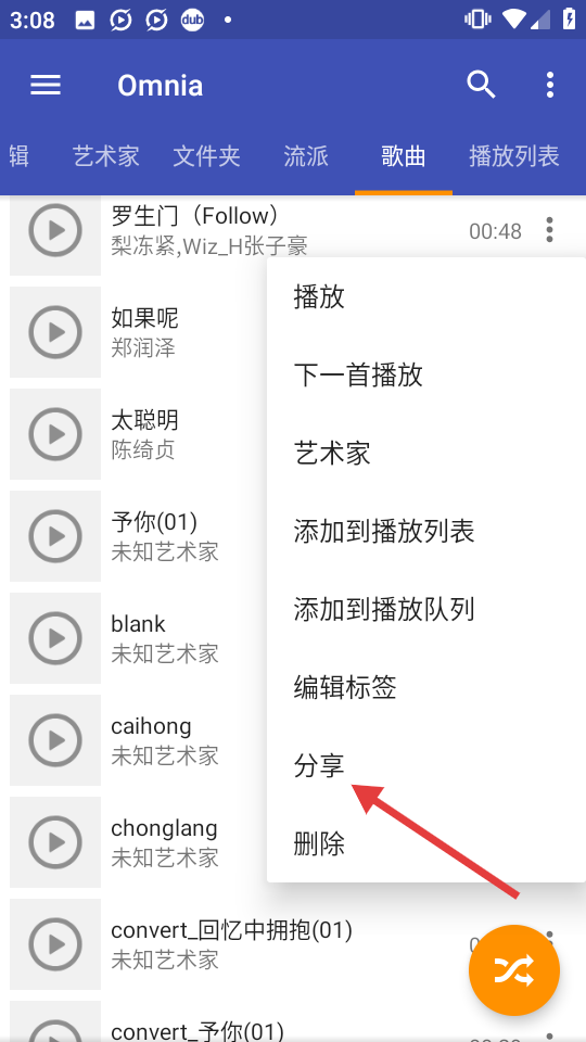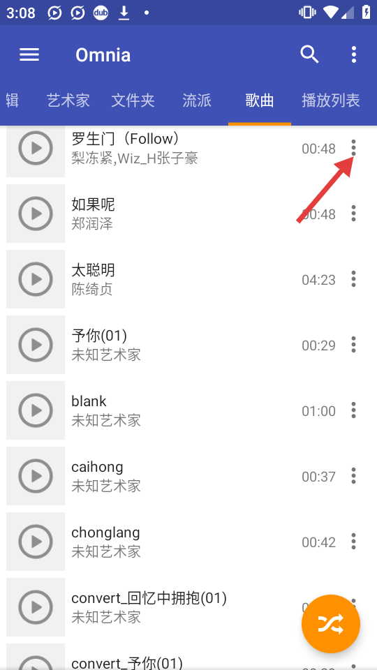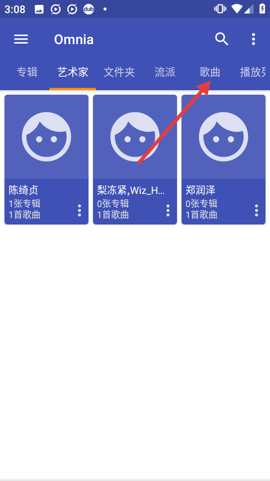 1、在Omnia应用中,点击【歌曲】标签可切换到歌曲列表页面。