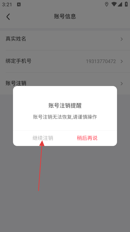 4、在账号注销提醒弹窗中,点击【继续注销】按钮,可进行账号注销操作。