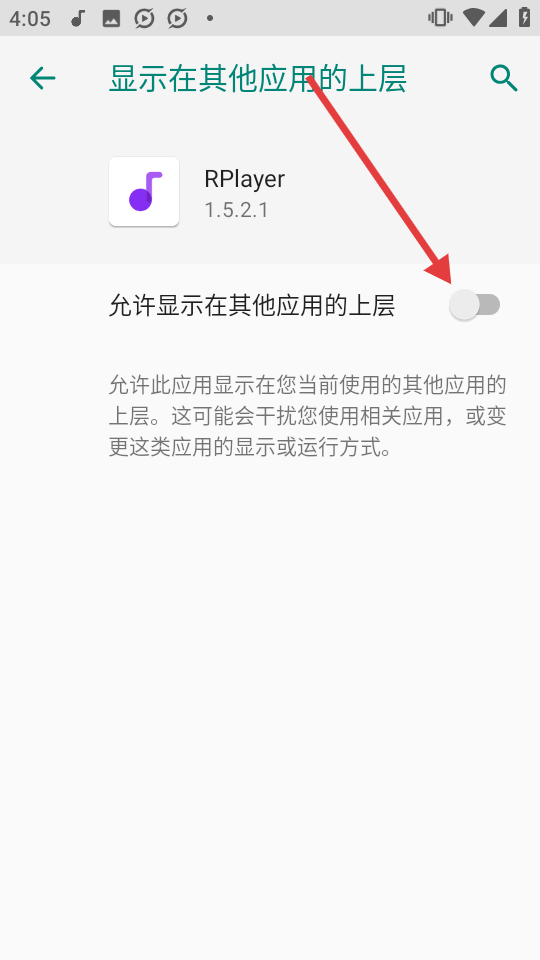 4、在“显示在其他应用的上层”设置界面,点击【允许显示在其他应用的上层】的开关。