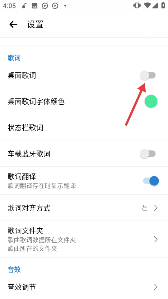 3、在设置页面,点击【桌面歌词】的开关,可开启桌面歌词功能。