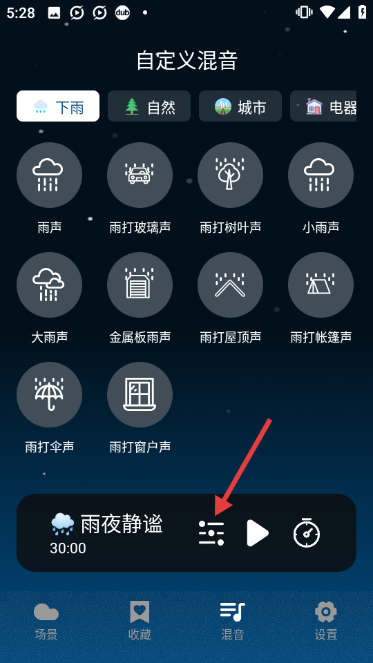 2、在自定义混音页面,点击【雨夜静谧】下方的设置图标,进入声音编辑界面。