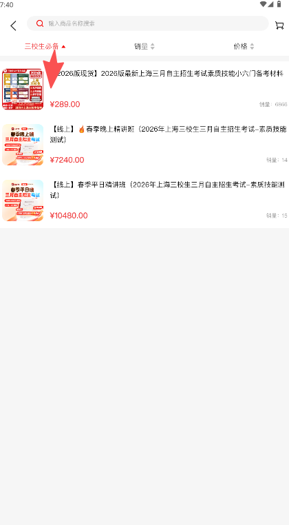 2、进入商品列表,能筛选不同班型与教材,显示具体价格与销量信息供参考。