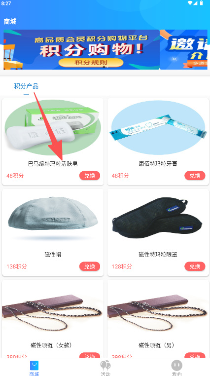2、于“积分产品”区域中,选择一款如“巴马缘特玛粒活肤皂”的具体商品。