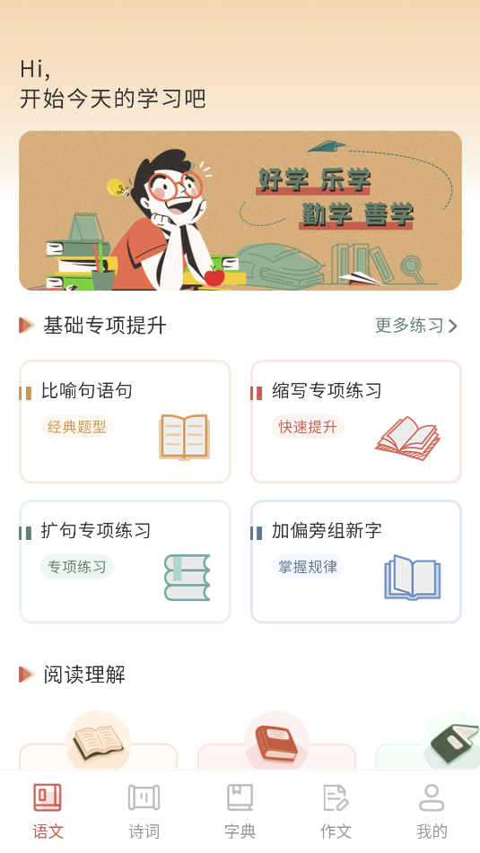 1、进入APP,可选择语文课程的比喻句讲解、缩写练习等专项学习方式。
