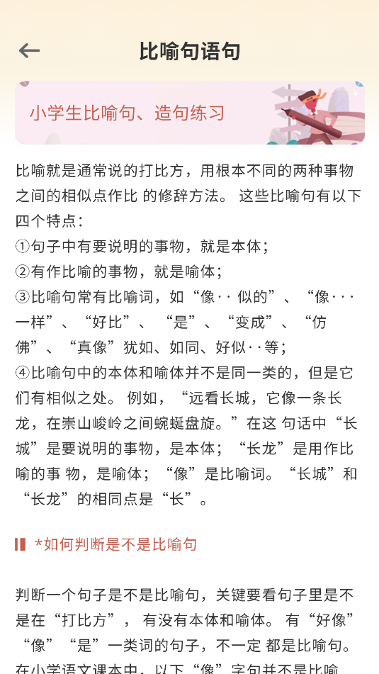 2、比喻句页面,可以阅读比喻句和造句的专项学习。