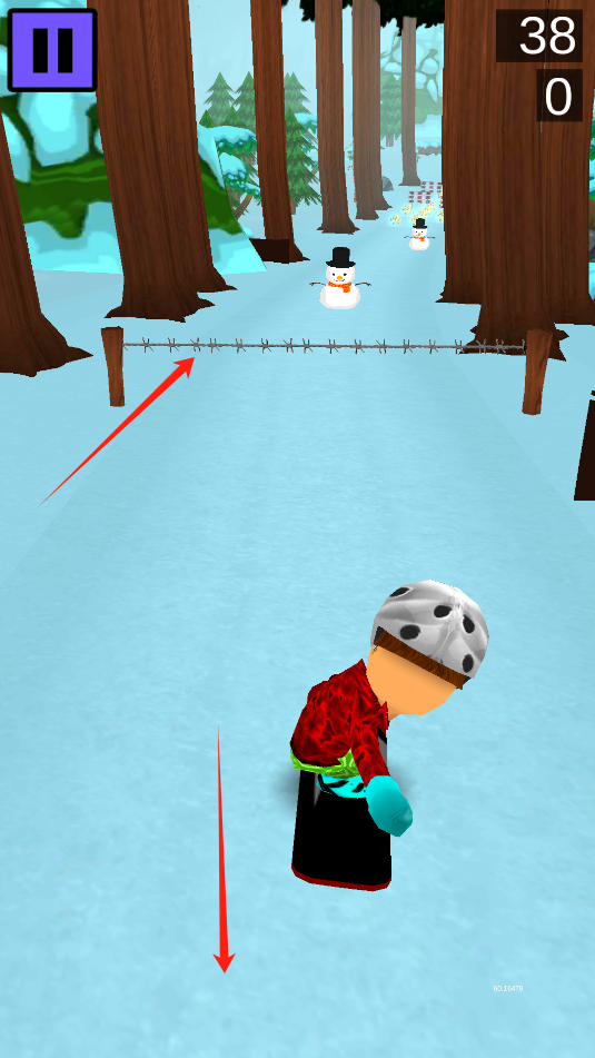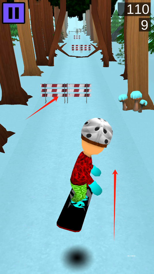 2、游戏开始,左右滑动屏幕控制角色改变滑雪位置,遇到铁丝障碍物按住屏幕向下滑动屏幕,让角色往下蹲滑。