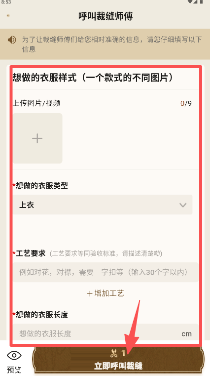 3、在需求发布页详细填写衣服样式、工艺要求等信息,最后点击“立即呼叫裁缝”。