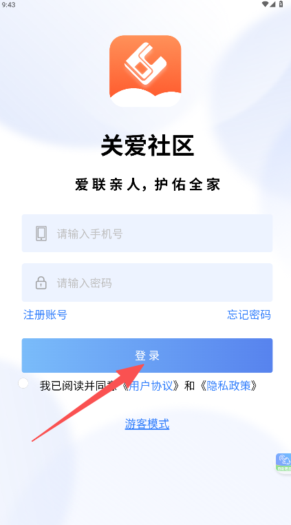 1、在应用登录界面输入手机号与密码,勾选同意协议后点击“登录”。