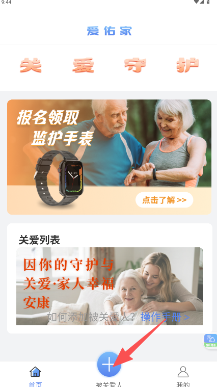 2、于“被关爱人”页面点击底部中央的加号按钮。