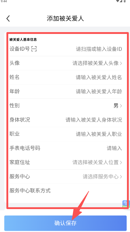 3、在信息填写页完善被关爱人的基本资料与设备信息,最后点击“确认保存”完成添加。