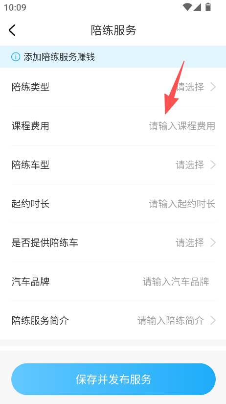 2、在招生服务中选陪练服务,填写陪练类型、费用等信息后保存发布。