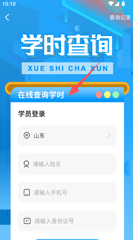 3、进入学时查询,学员填写地区、姓名、手机号、身份证号即可查询。