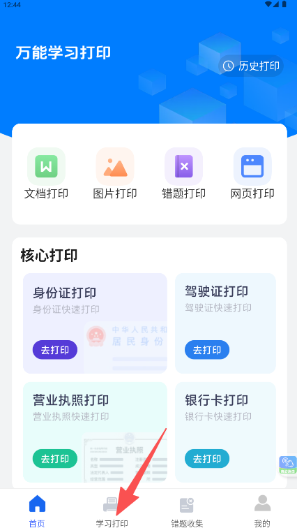 《万能学习打印》专注于学习资料的便捷打印输出。核心功能覆盖文档、图片、网页及错题的快速打印,特别设置身份证、驾驶证等常用证照的专项打印模块。界面布局清晰,四大核心功能入口明确,核心打印区域将高频需求集中展示。软件将通用打印与学习场景结合,满足证件复印、资料整理等多样化需求,提升文件处理的效率。