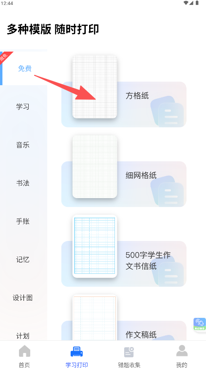 2、学习打印板块提供丰富的专用模板库,如方格纸、田字格等,满足特定学习场景。