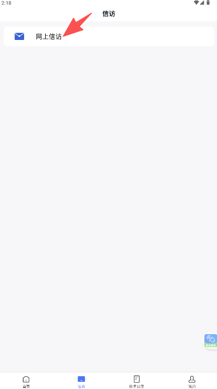 1、在应用首页底部导航栏“信访”点击此处。