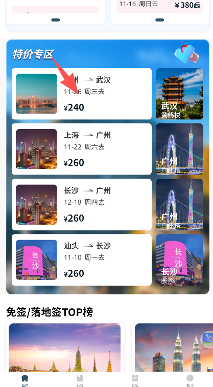2、特价专区板块直接展示热门航线的优惠票价与日期,便于快速发现并预订高性价比航班。