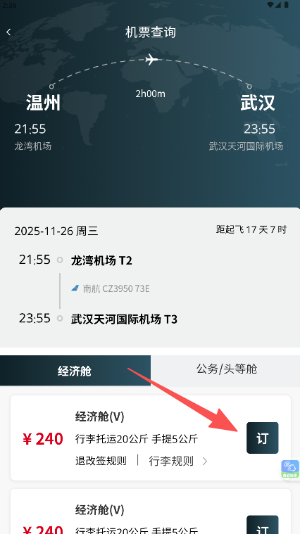 3、在航班详情页确认行程与票价,点击“订”进入预订流程。