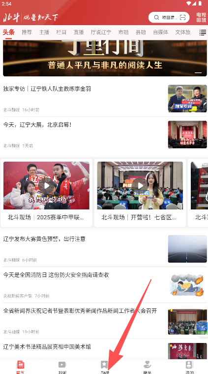 1、在应用底部导航栏点击“融媒”进入广播电视直播与点播节目。