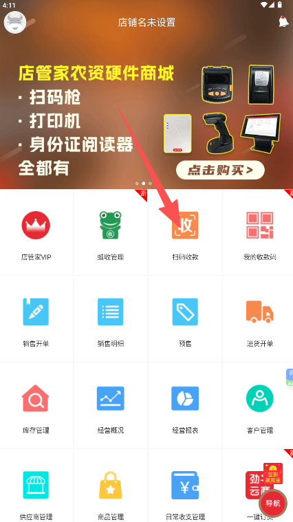 2、进入主界面,在功能图标区找到并点击“扫码收款”功能入口。