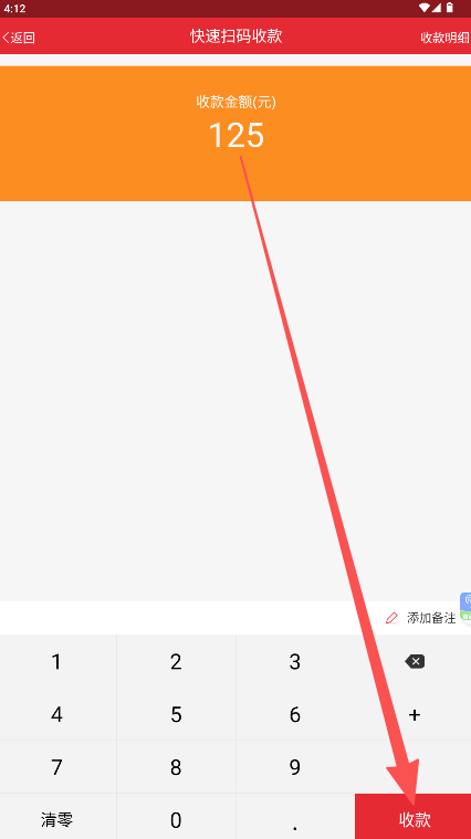 3、进入扫码收款界面,输入或通过数字键盘输入金额,点击“收款”完成操作。