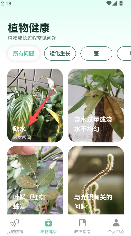2、问题覆盖全面,植物健康板块包含缺水、浇水不均、叶螨等多种成长问题,满足植物常见问题查询需求。