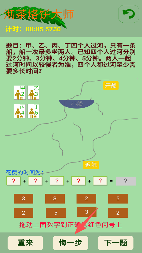 2、做题形式互动,如过河问题需拖动数字计算时间,提升数学题练习的趣味性与参与感。