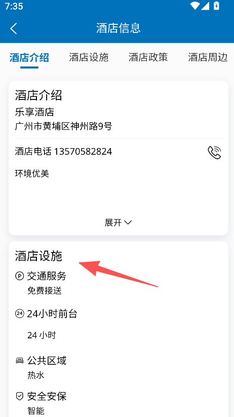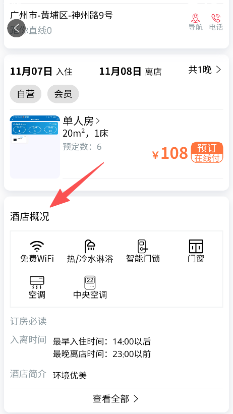 1、信息分类明确,酒店信息按概况、设施、政策等分类展示,快速定位所需内容,使用高效。
