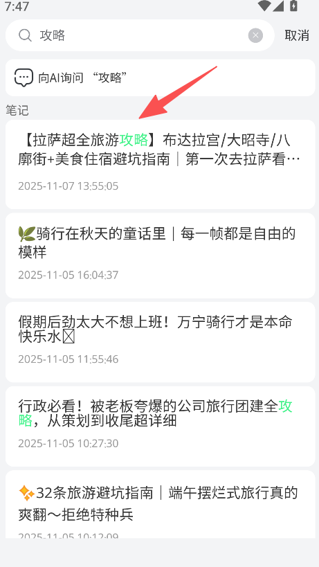 1、搜索精准度高,输入关键词即可匹配相关旅游攻略笔记,信息获取便捷且针对性强。