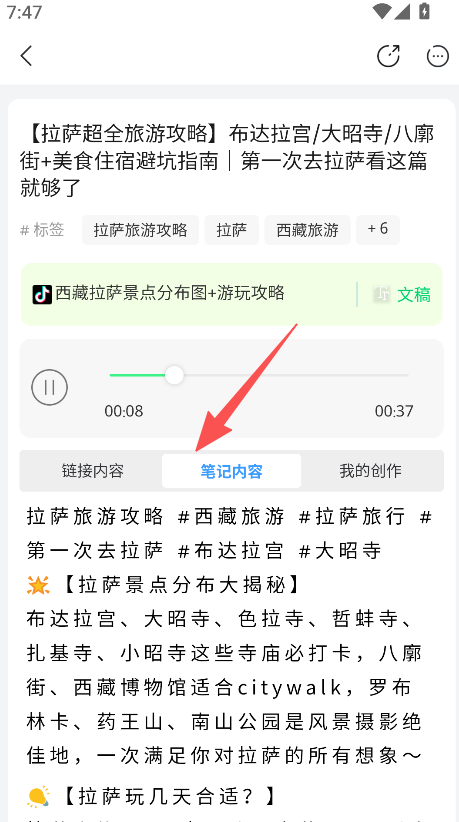 2、选择感兴趣的笔记(如拉萨旅游攻略),点击进入。