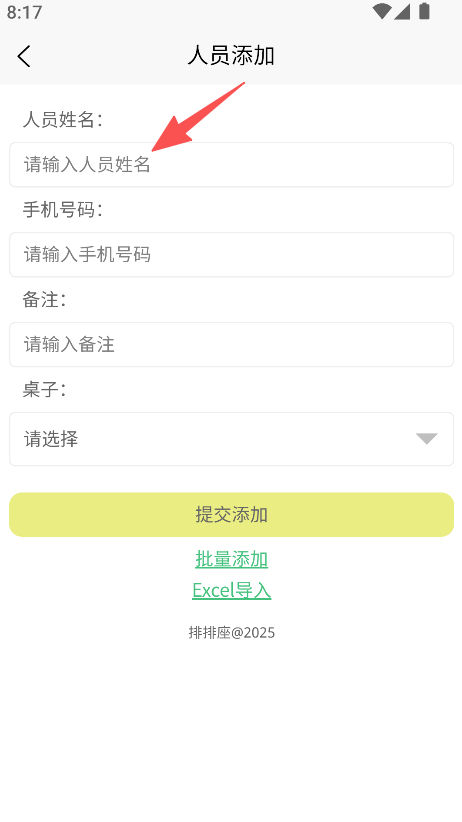 2、进入人员添加页面,输入姓名、手机号并选择桌子提交。