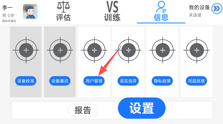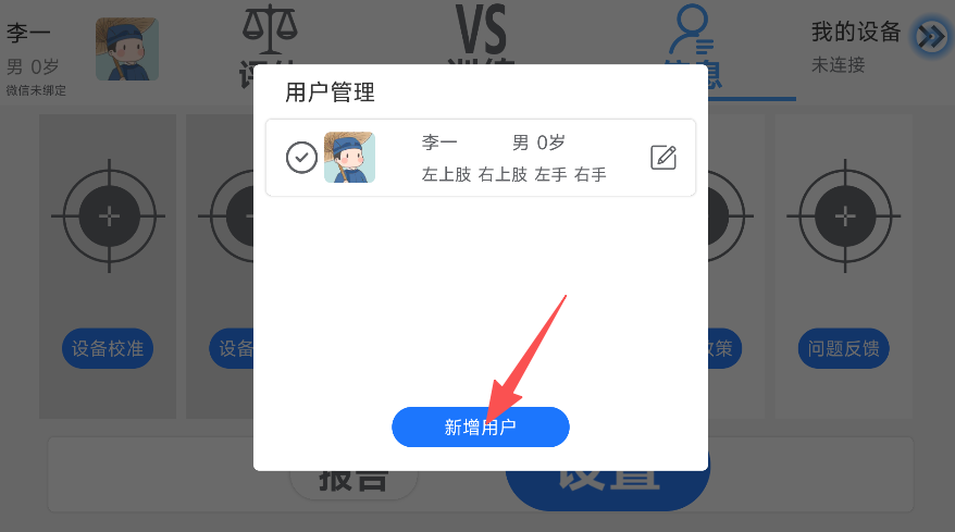 1、具备用户管理功能,可新增用户并设置训练部位,实现健康设备使用对象的信息管理与训练部位的精准规划。